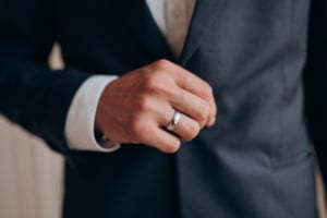 Herren tragen möglichst nur eine schlichte Uhr und maximal zwei Ringe. Mit einem eleganten Ledergürtel rundest du dein Outfit perfekt ab. Achte darauf, dass der Gürtel und das Armband deiner Uhr zu deinen Schuhen passen.