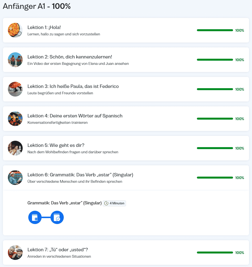 Im Bereich Lernen beziehungsweise Lektionen sind die vier Sprachniveaus mit den jeweiligen Lektionen zu finden. Hier kannst du sehen, welche der Lektionen und damit welchen Anteil der Niveaus du bereits absolviert hast.