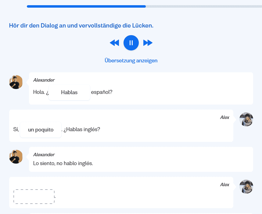 Auch auf den kommunikativen Lerntyp wird wenig eingegangen. Diese Menschen lernen am Besten im Gespräch. Die Dialog-Übungen simulieren zwar ein Gespräch, doch letztendlich musst du nur Lücken im vorgegebenen Gespräch füllen, anstatt ein eigenes zu führen.