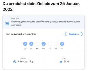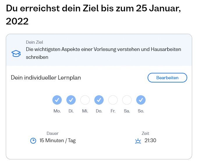 Du setzt dir zu Beginn ein bestimmtes Lernziel, das du erreichen möchtest und hast sogar einen konkreten Zeitpunkt vor Augen, an dem du das Ziel erreichen wirst – vorausgesetzt du absolvierst deine geplanten Lerneinheiten. Zusätzlich kannst du eine Erinnerung aktivieren, die dich an deine festgelegten Lernzeiten erinnert.