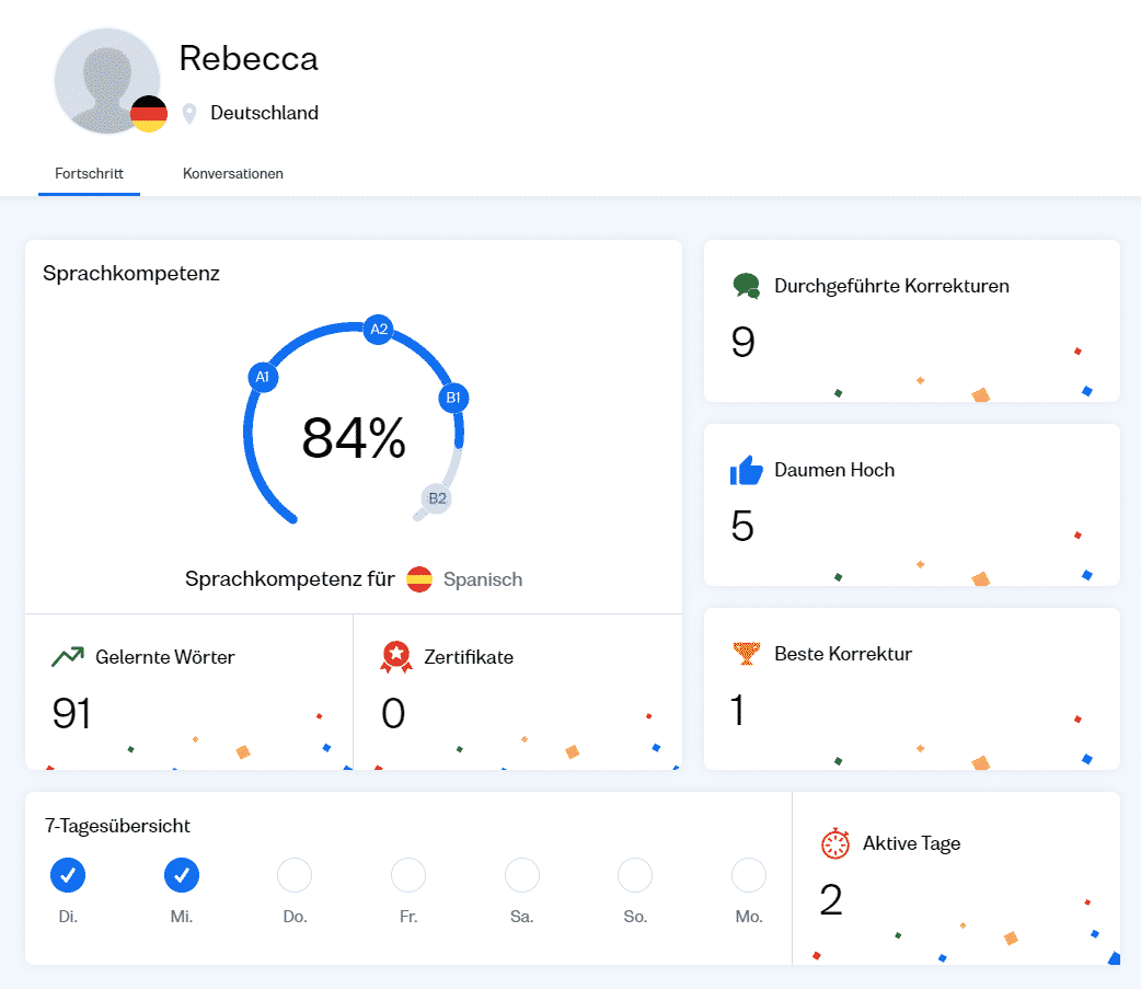 Wenn du zum Beispiel Spanisch lernst, werden deine geschriebenen oder gesprochenen Antworten von spanischen Muttersprachlern korrigiert und gegebenenfalls kommentiert. Genauso bekommst du als deutscher Muttersprachler Antworten von Deutschlernenden angezeigt, die du korrigieren kannst.