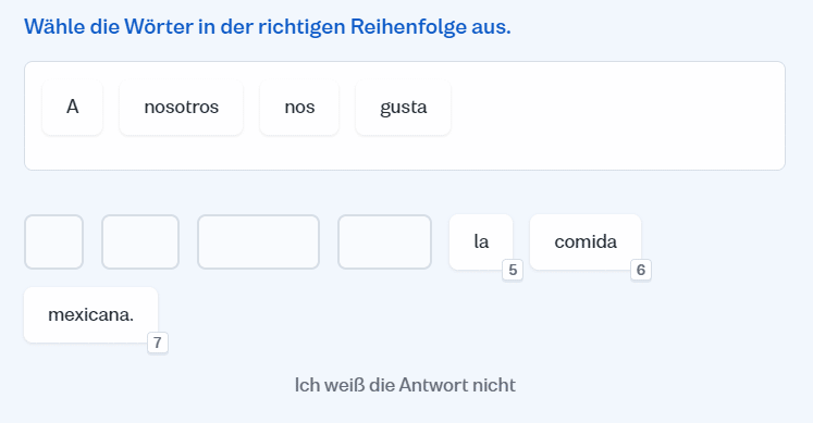 Egal ob die Lektion mit einer Grammatikregel, einem Text, einer Audiodatei, einem Dialog oder einem Video beginnt – im Laufe jeder Lektion musst du darauf basierend verschiedene Übungen meistern.