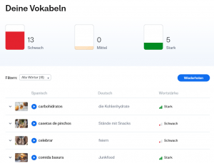 Außerdem siehst du, wie viele Wörter du bereits und wie viele Tage du bisher aktiv gelernt hast. Diese Angaben können dich motivieren, am Ball zu bleiben.