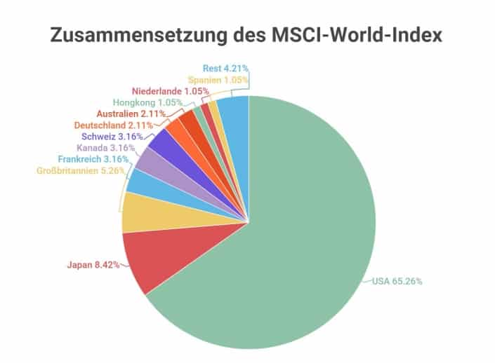 Die USA verfügen über den weltweit größten Aktienmarkt und sind so mit einem Anteil von knapp 63 Prozent im ETF enthalten. Wer also Wert darauf legt, sein Geld möglichst gleichmäßig auf die weltweiten Indizes zu verteilen, sollte den MSCI-World-ETF daher mit anderen ETFs kombinieren.
