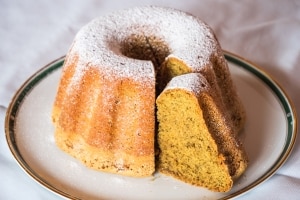 - Stürze den Gugelhupf auf ein Kuchengitter und lasse ihn auskühlen. Garniere ihn mit Puderzucker. Alternativ kannst du aus 200 Gramm Puderzucker und dem Saft einer halben Orange einen Zuckerguss herstellen.