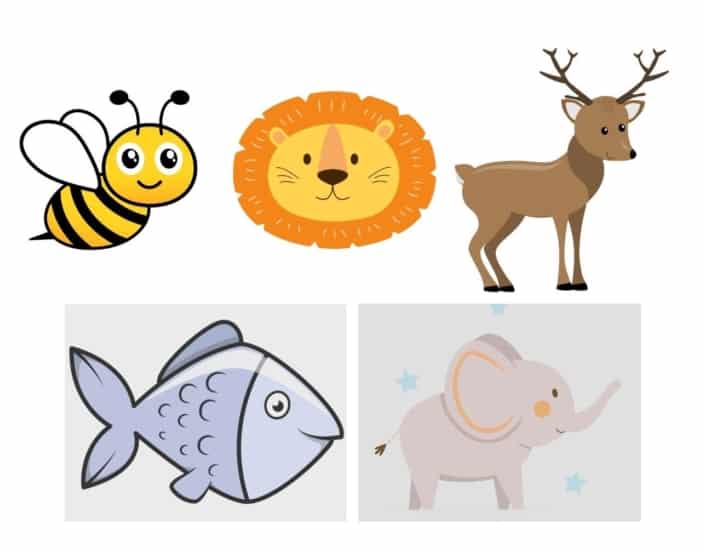 Hirsch — Elefant — Löwe — Biene — Fisch
