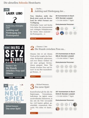 Passend zum Konzept wollte Sobooks vor allem im Bereich Ratgeber und Sachbücher punkten, wo es einen besonders großen Bedarf an Austausch gibt. Statt händlertypisch mit einem Vollsortiment startete Sobooks nach einem Jahr Beta-Phase zur Frankfurter Buchmesse 2014 mit nur ein paar Dutzend ausgewählten Titeln, innerhalb derer sich Debatten entfalten sollten. Was allerdings allenfalls rudimentär passierte, obgleich Sobooks dank der prominenten und medienaffinen Geschäftsführer rund um den Start ein Presse-Echo beschieden war, von dem andere Startups nur träumen könnten.