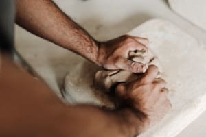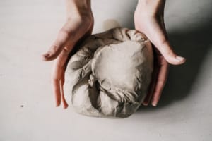 Durch Schlagen und Kneten kann eingeschlossene Luft entweichen und du stellst sicher, dass deine Töpferarbeit den Brennvorgang unbeschadet übersteht.
