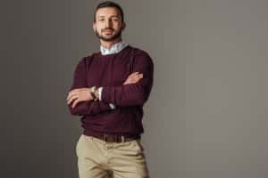 Steuere diesem Verhalten mit selbstbewussten Gesten entgegen, beispielsweise mit einem nach oben gerichteten Kinn, aufrechtem Stehen oder Händen, die in die Hüften gestemmt werden.